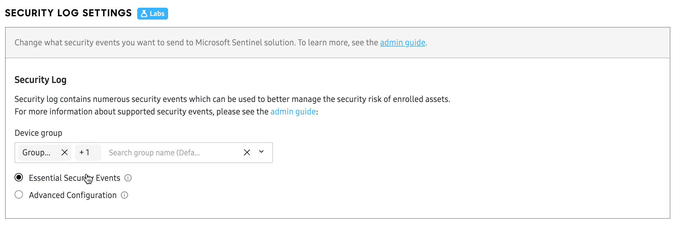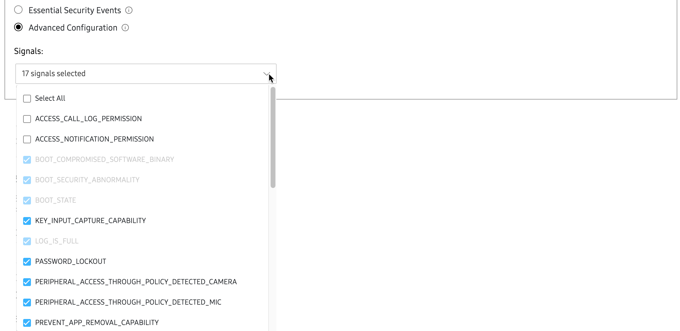 - Essential Security Events: When you select this option, a list of 13 events curated by the Samsung Knox team is automatically selected for you. This list balances both device performance and log pressure in your Sentinel environment.
