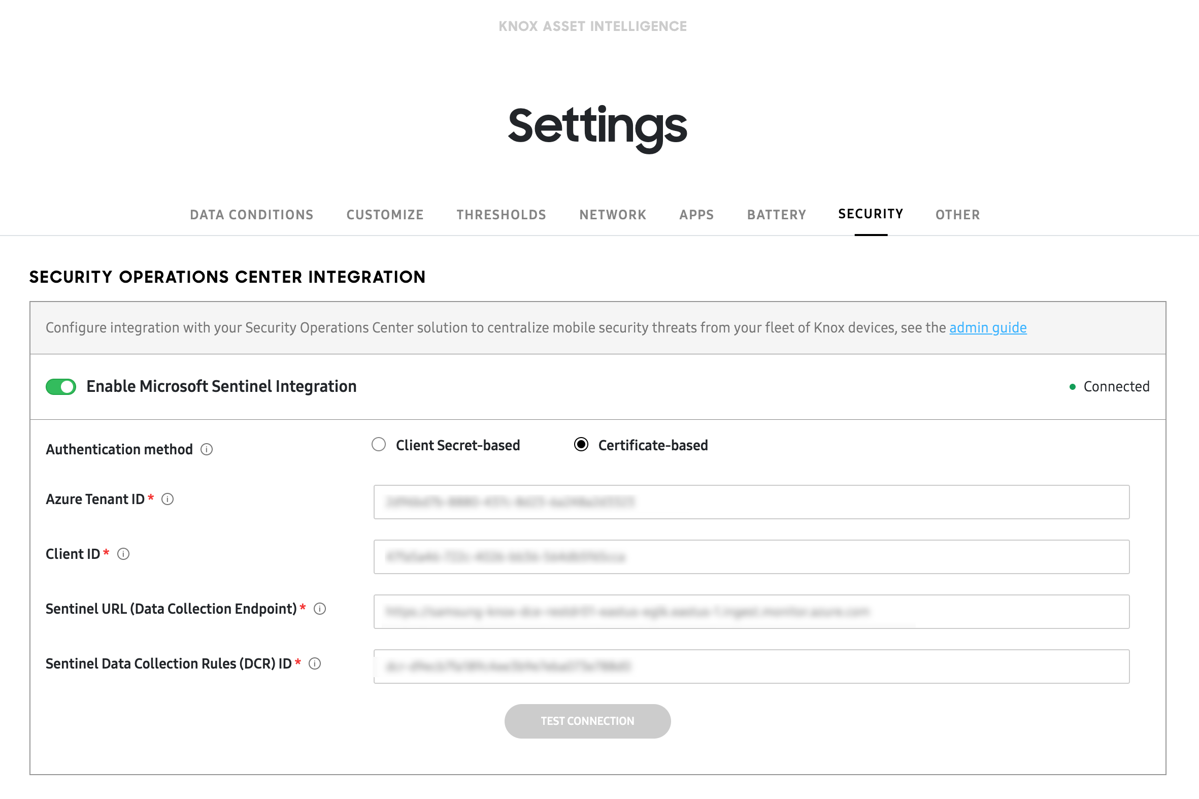 After you’ve configured Sentinel, you’re ready to configure your Knox Asset Intelligence console. From your Dashboard Settings, do the following: