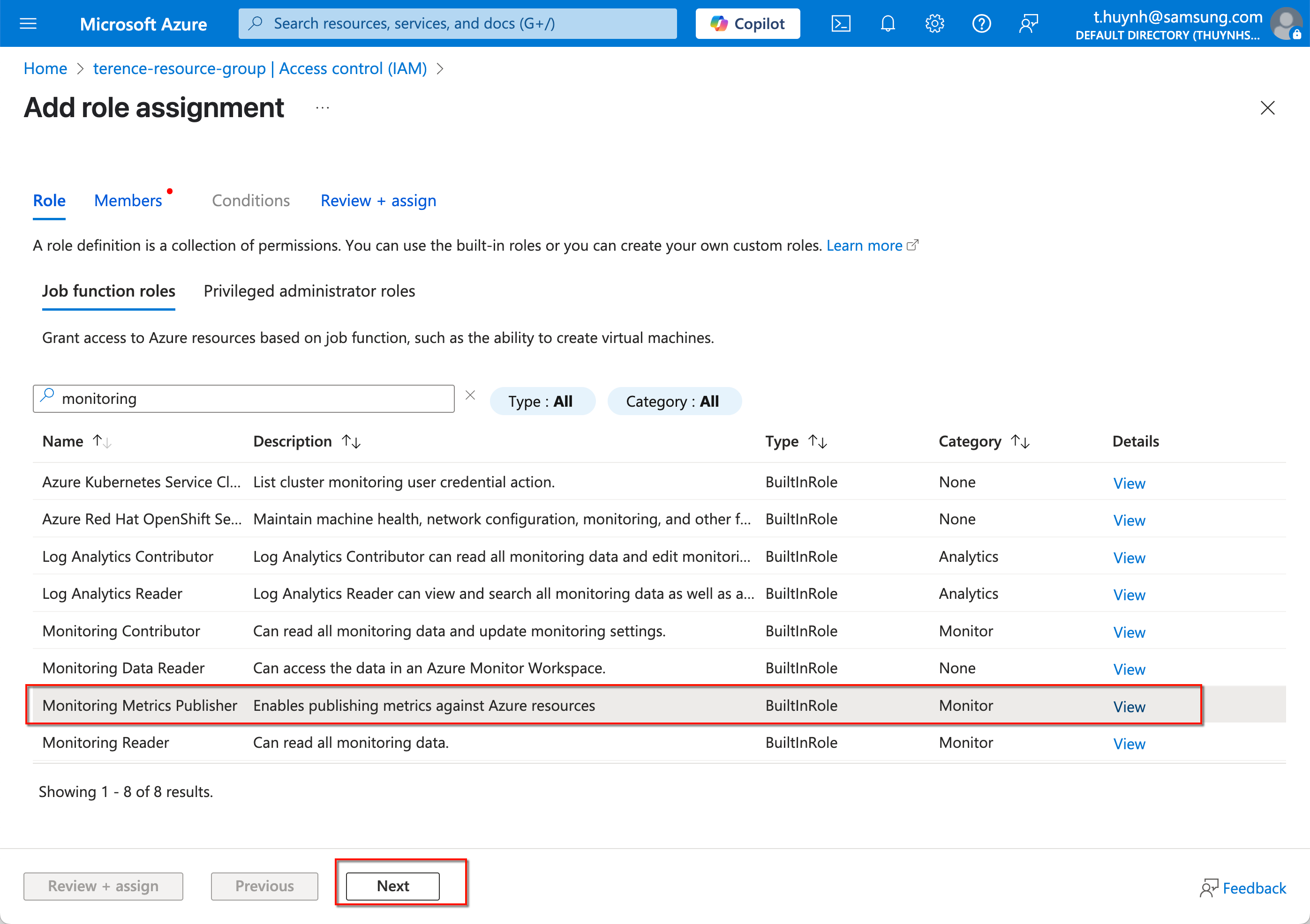 On the role assignment page, search for Monitoring Metrics Publisher, then select the role and click Next.