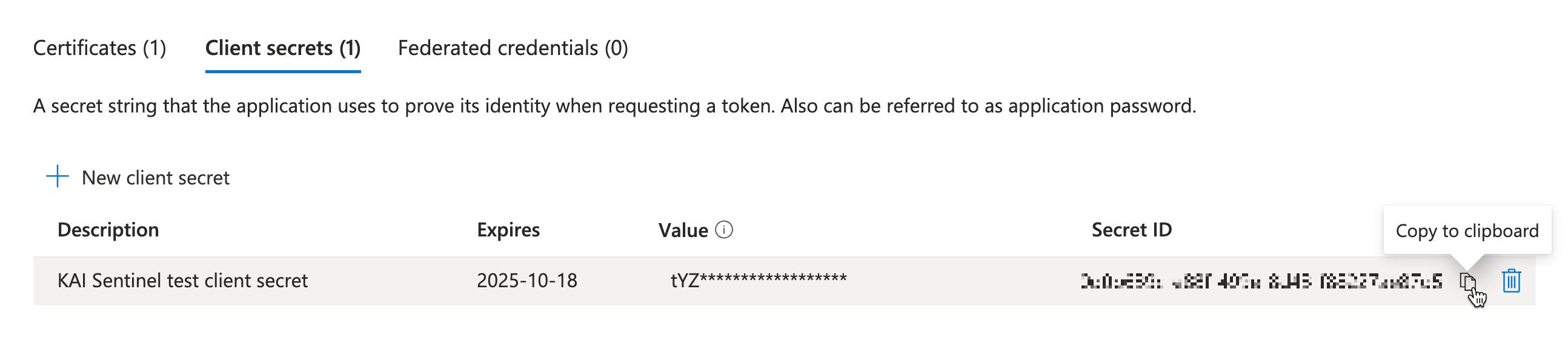 To use a Client secret credential, click the Client secrets tab > New client secret, then provide a description and expiration date for the key. Once the key is added, copy the Secret ID to a notepad, as this will be required later in the configuration if you are using this type of credential to authenticate.