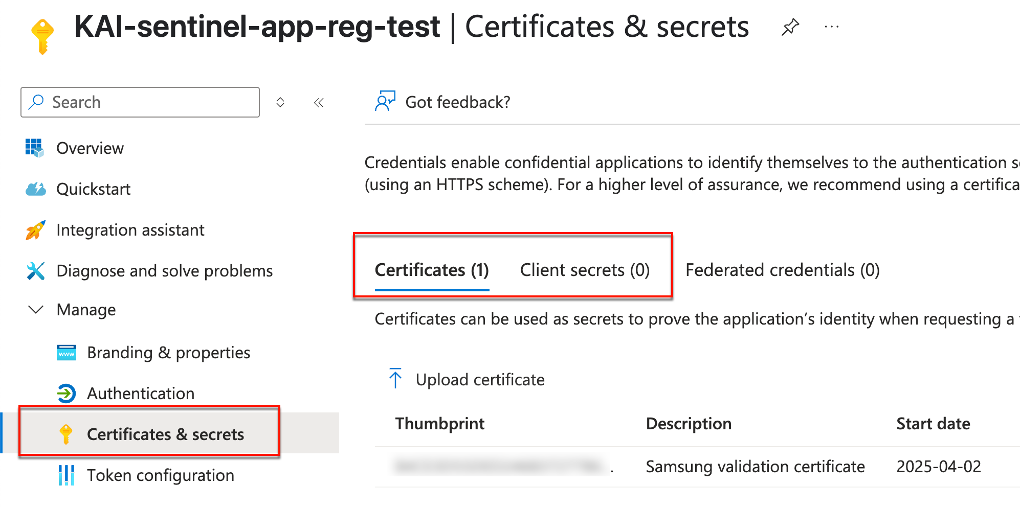 Next, you’ll need to create app credentials to allow Knox Asset Intelligence to authenticate itself in Sentinel. From the same app registration overview page, go to Manage > Certificates & secrets in the left navigation pane. You can either upload a signed Samsung Certificate, or create your own Client secret key.
