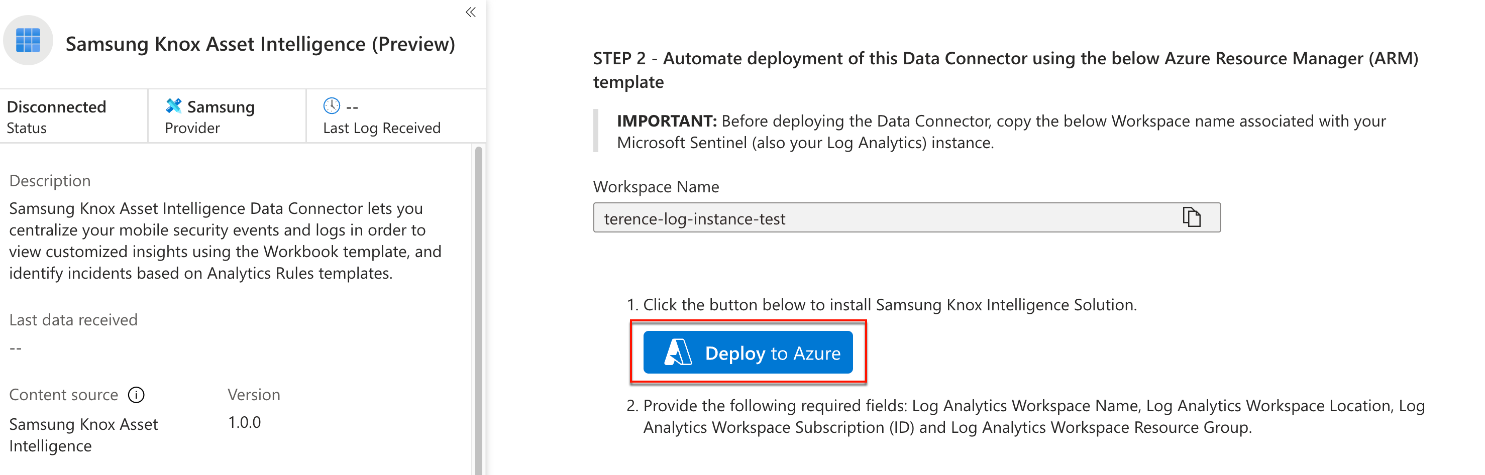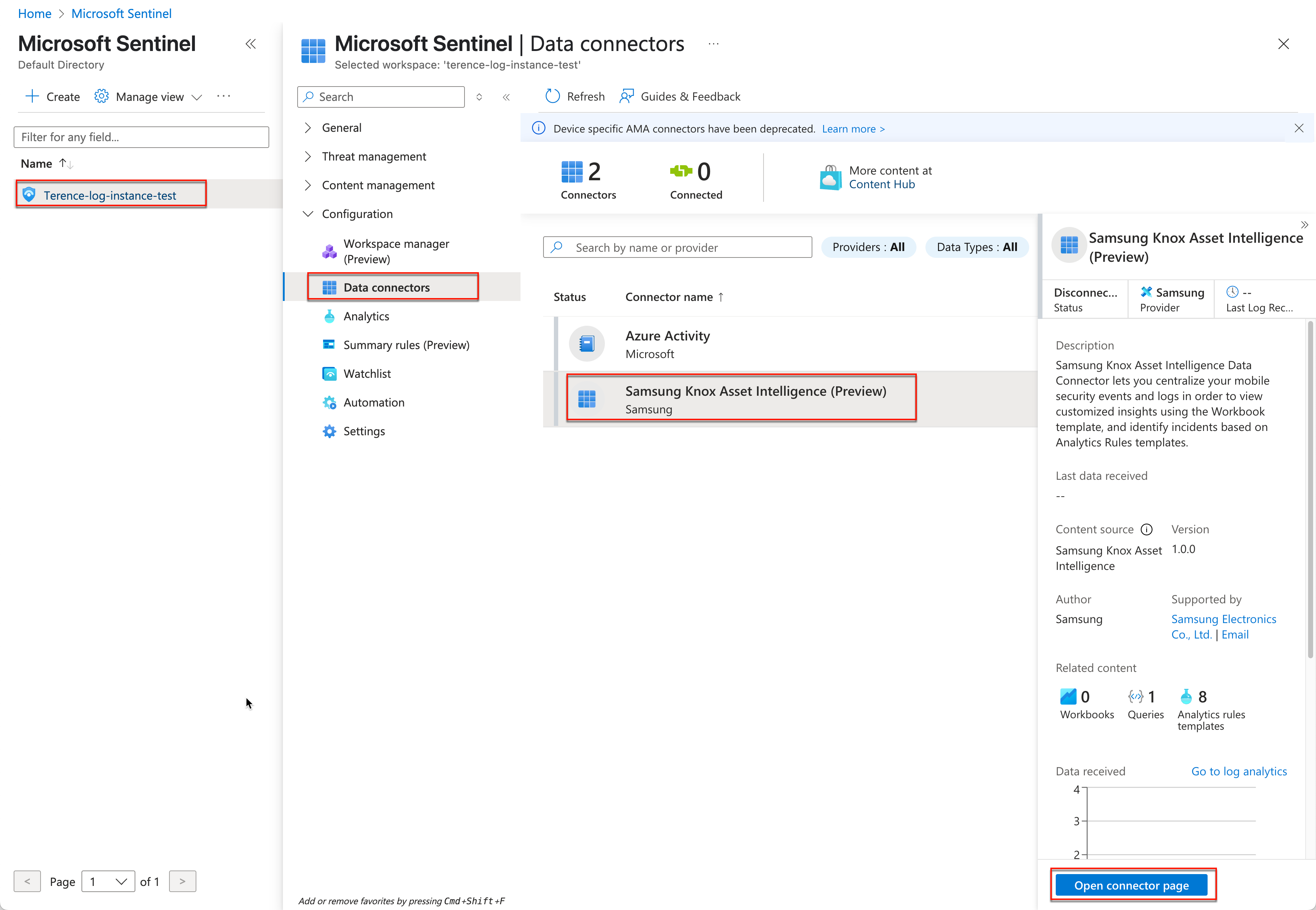 On the next page, Click your Sentinel instance name, then click Data connectors. On the list of available connectors, click Samsung Knox Asset Intelligence, then in the side panel, click Open connector page.