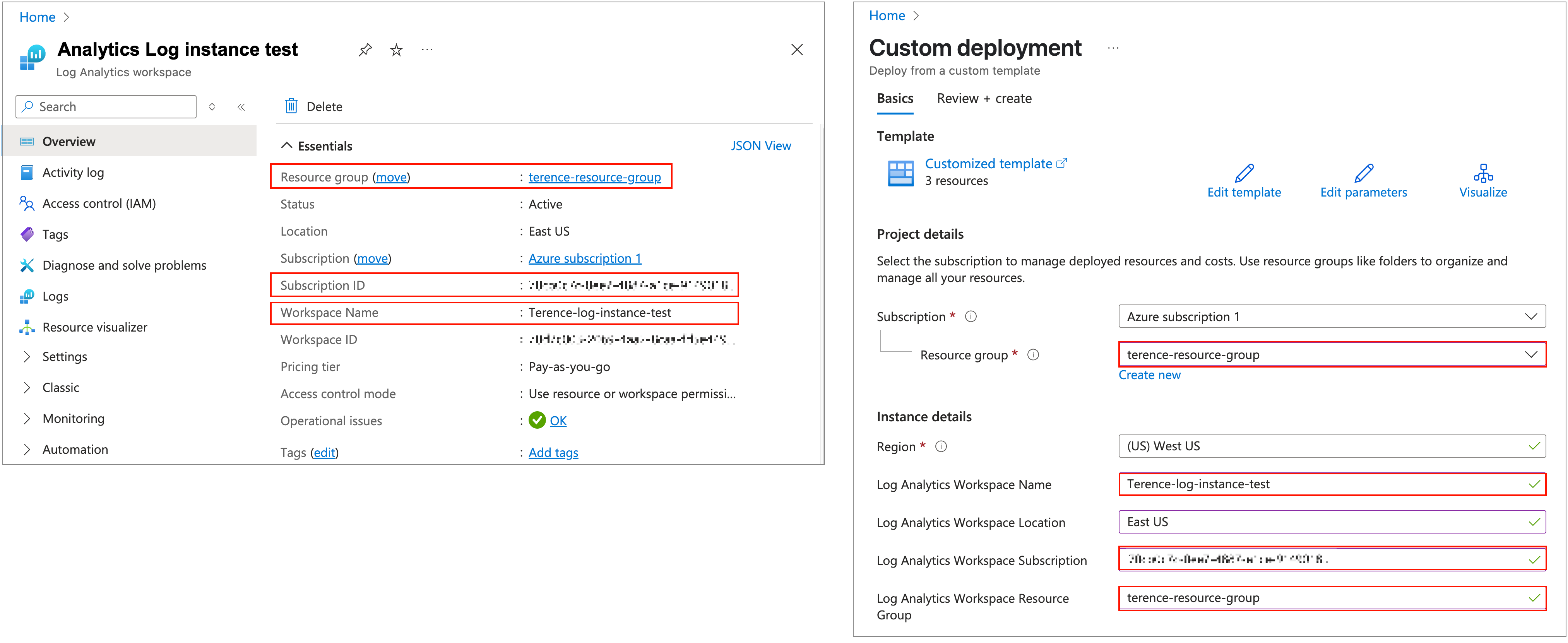 The Custom deployment template’s Log Analytics Workspace Subscription field is mapped to the Log Analytics Workspace Subscription ID, and not the Subscription name.