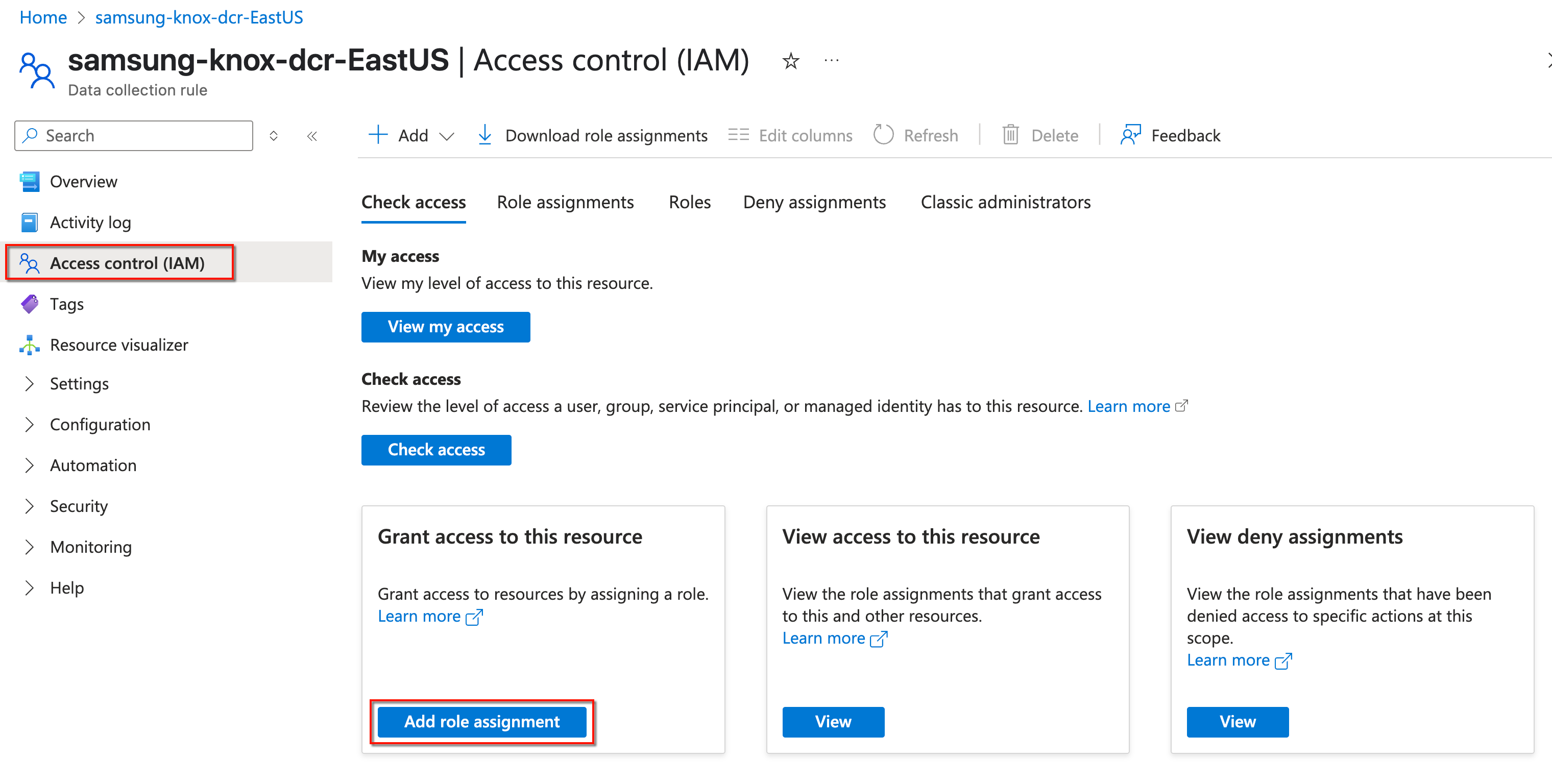 Return to your Resource group Overview page, click Access control (IAM) in the left navigation pane, then click Add role assignment.