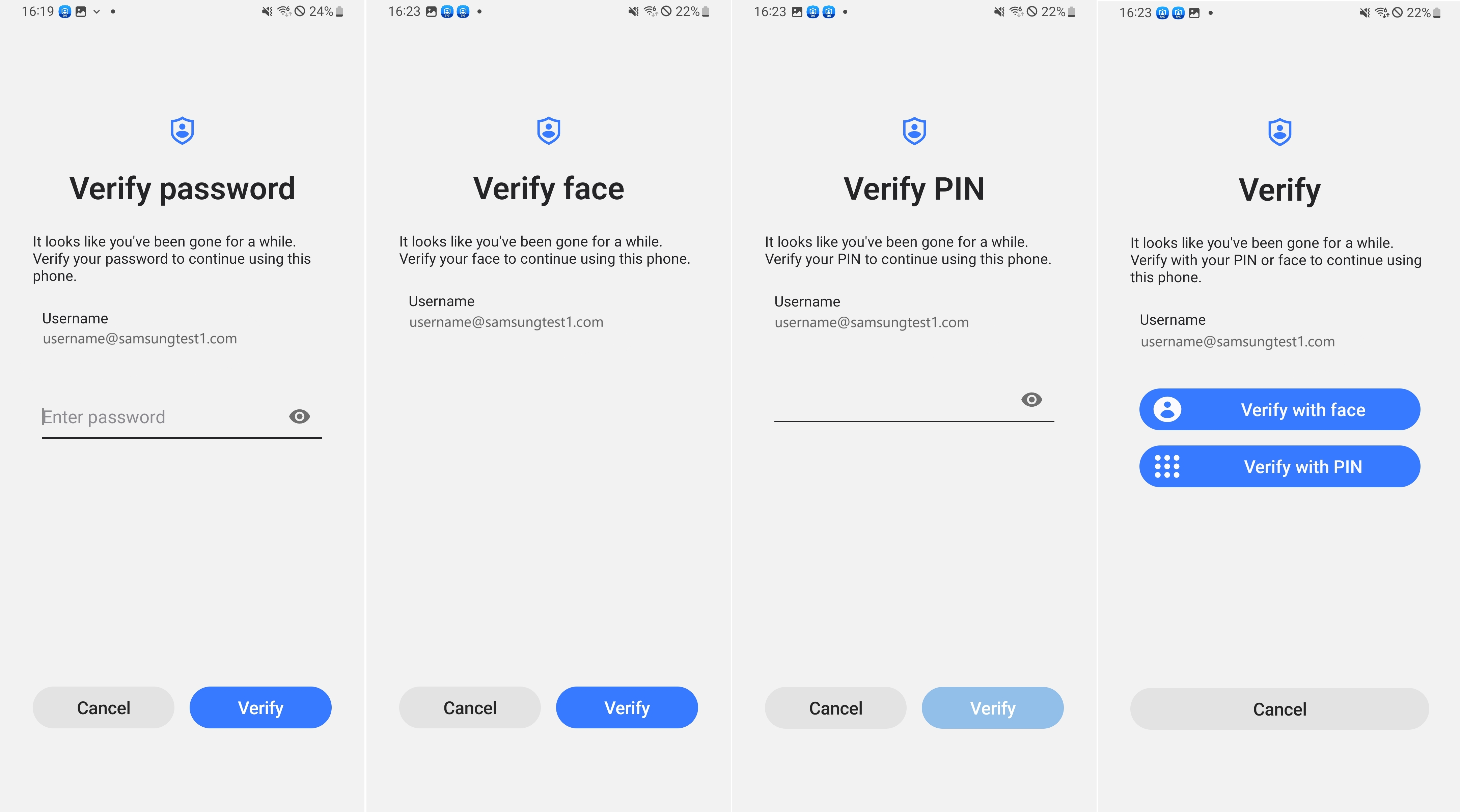 Device users must authenticate their identity when initially signing in to the Knox Authentication Manager app. If reverification is enabled, they must also authenticate their identity when signing back into a locked device.