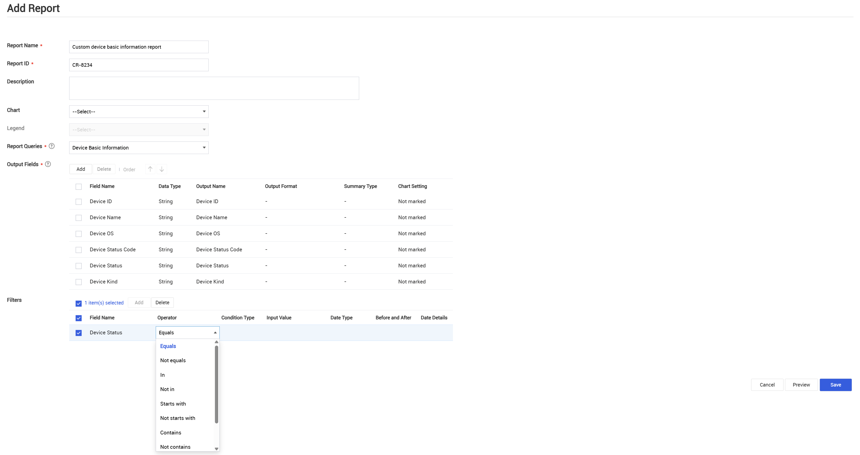 (Optional) Click Add in the Filters area to open the Add Output Field dialog. Select fields that you want to use to filter your report.
