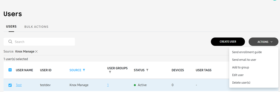 You can create and send emails to your Knox Manage users. To create an email template, click on your profile icon then click Settings. Then, navigate to the KNOX MANAGE section and click USER EMAIL TEMPLATES.